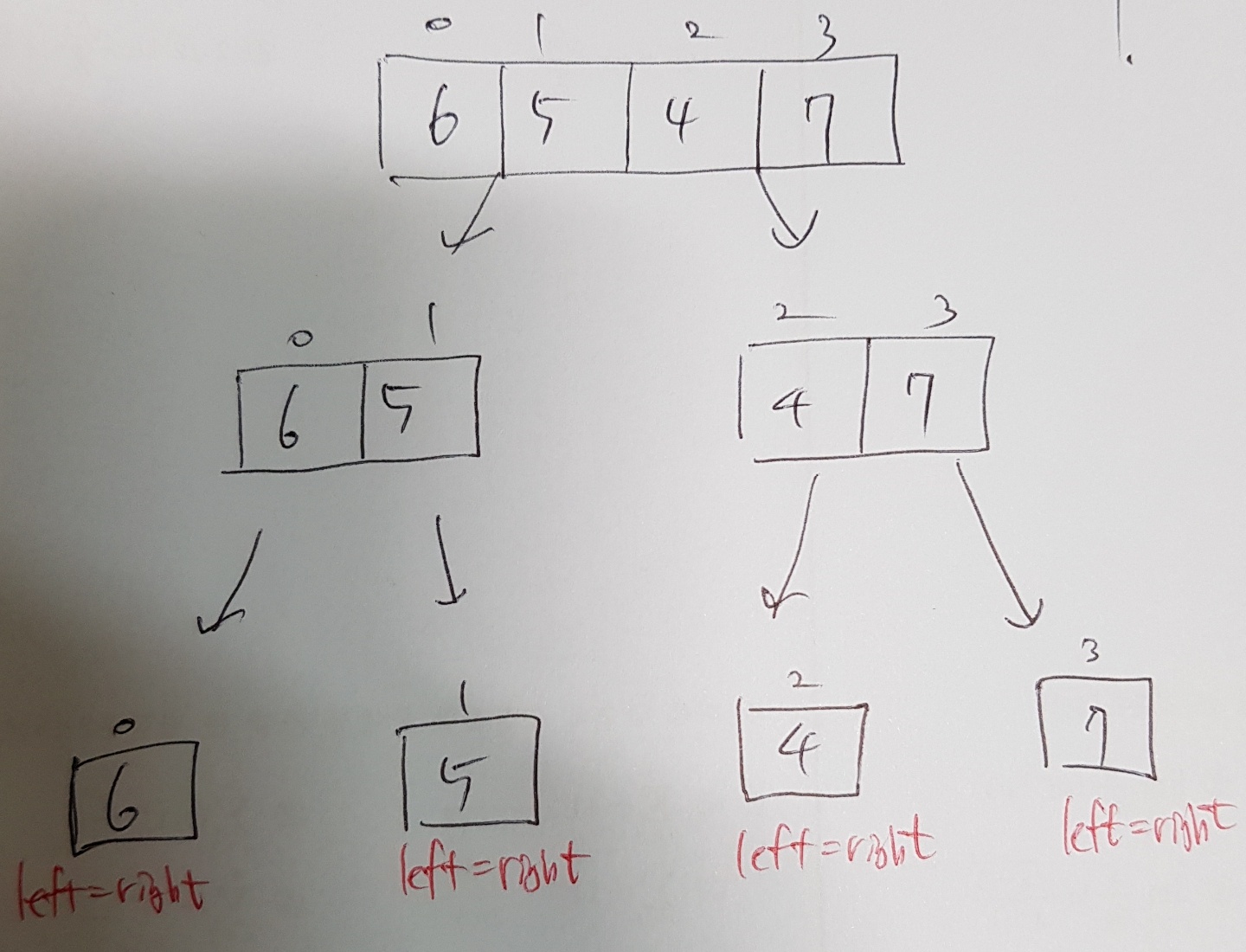 왜 하나씩 구분이 될 때까지 둘로 나누며 구분을 하는 걸까? 처음부터 하나씩 구분을 해버리면 더 간단할 수 있지만, 재귀적으로 구현하기 위하여 둘로 나눠준다.