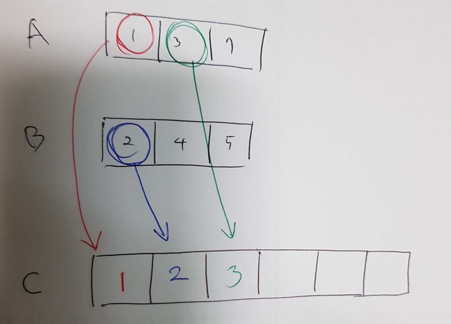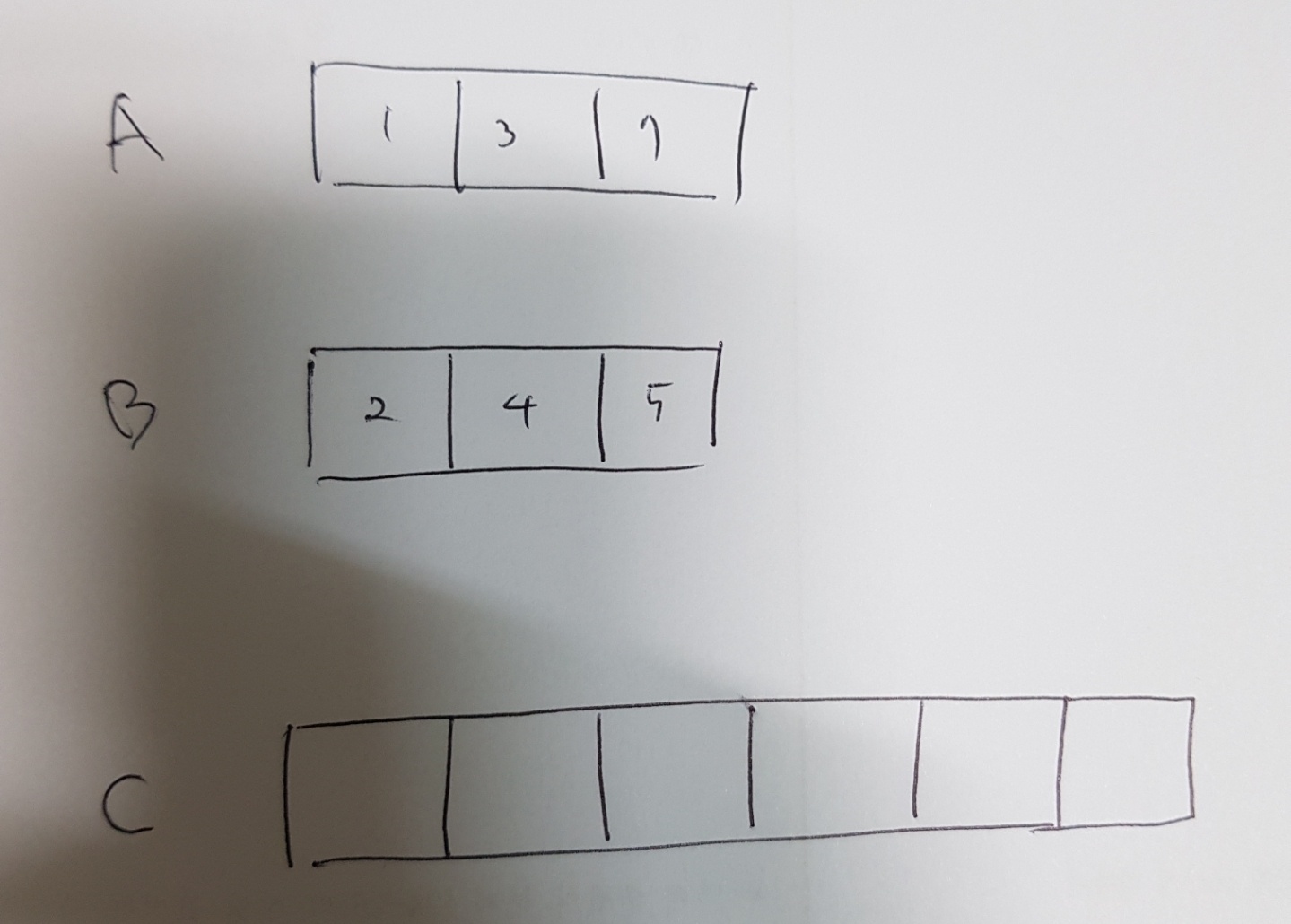 배열 A,B에 있는 숫자들을 배열 C로 오름차순으로 옮기고자 한다.