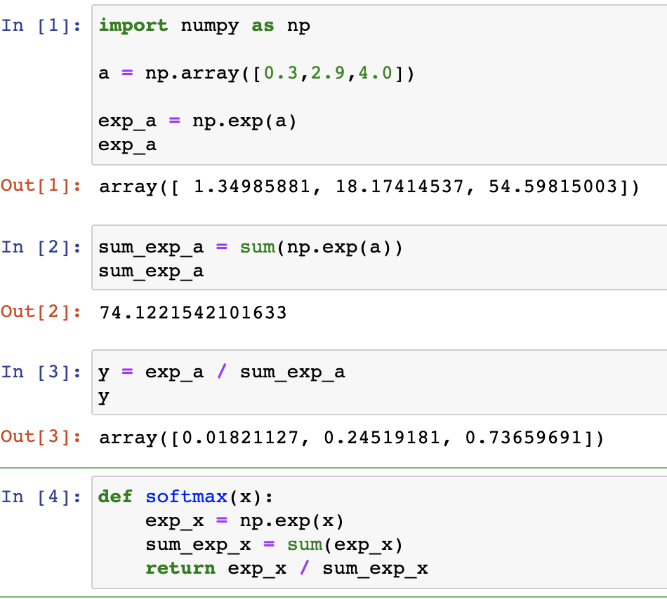 (주의점: 지수함수를 사용하여 아주 큰 값을 뱉기때문에 오버플로 문제가 발생할 수 있다. 그래서 이를 막기위해 입력 신호 중 최댓값을 이용한다. )