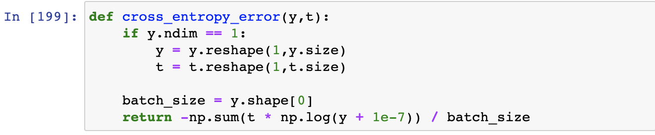 방법은 sum of squares, cross entropy 모두 동일한데, 1개 데이터에 대해서 loss를 구해주고 평균을 구하면 된다. 즉, 합을 구하고 크기로 나눠준다. => 평균 loss func