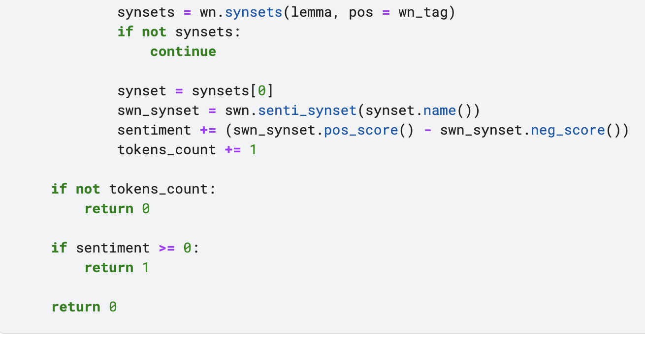 3)senti_synset에서 긍정/부정 지수를 구하고 합산해서 특정 임계치를 넘으면 긍정 평가, 그렇지 않을 때는 부정 평가로 결정합니다.
