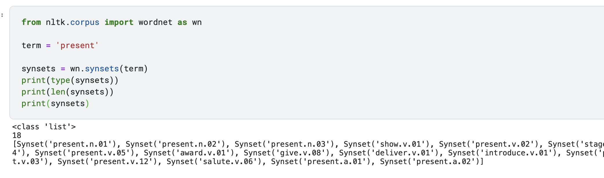 wordnet을 이용해서 synsets()을 사용하면 synset 객체 여러 개가 반환된다. 서로 다른 semantic을 가지는 객체다. 그리고 synset은 속성으로 part of speech(품사), definition, lemma 등을 가지고 있다. 의미를 구분해주기 위한 요소이다.