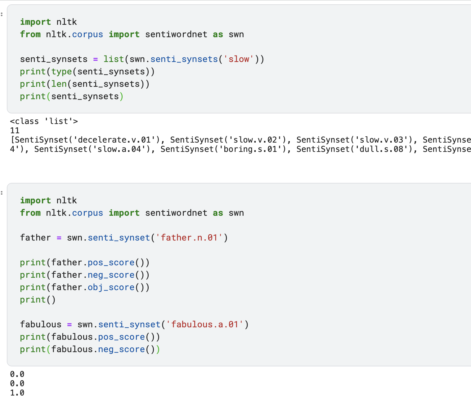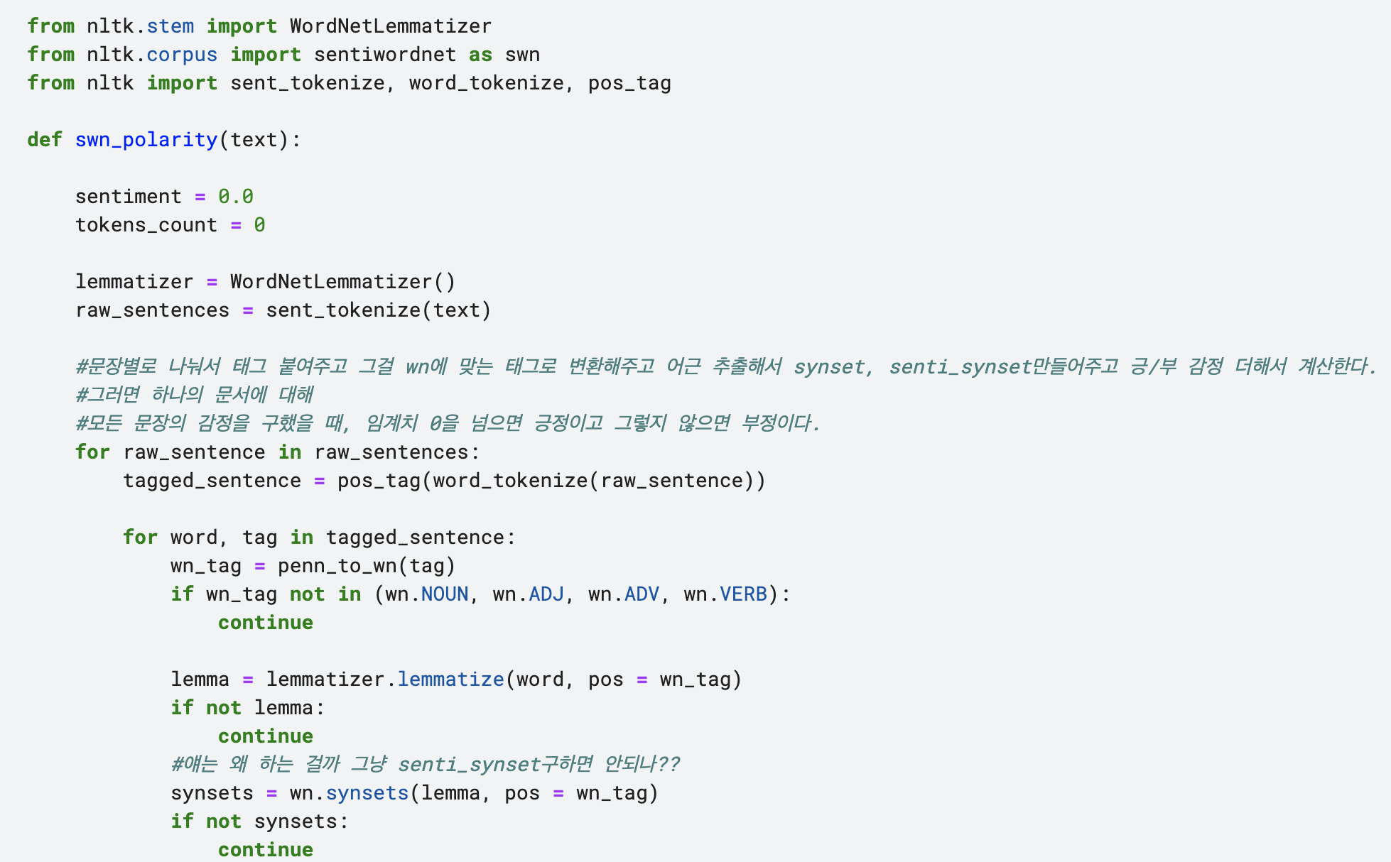 그런데 nltk에서 구현한 wordnet은 생각보다 성능이 좋지 않다는 단점이 있어서 다른 패키지의 감성 사전을 사용하기도 합니다.