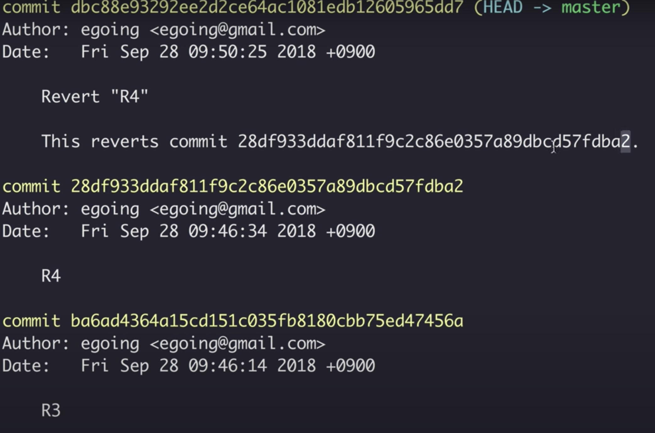 여기서 REVERT R4는 R3랑 같다. 즉, reset을 하게 되면 R4가 없어지게 되니깐 그 이력을 남겨두고 싶어서 revert를 사용하는 것이다.