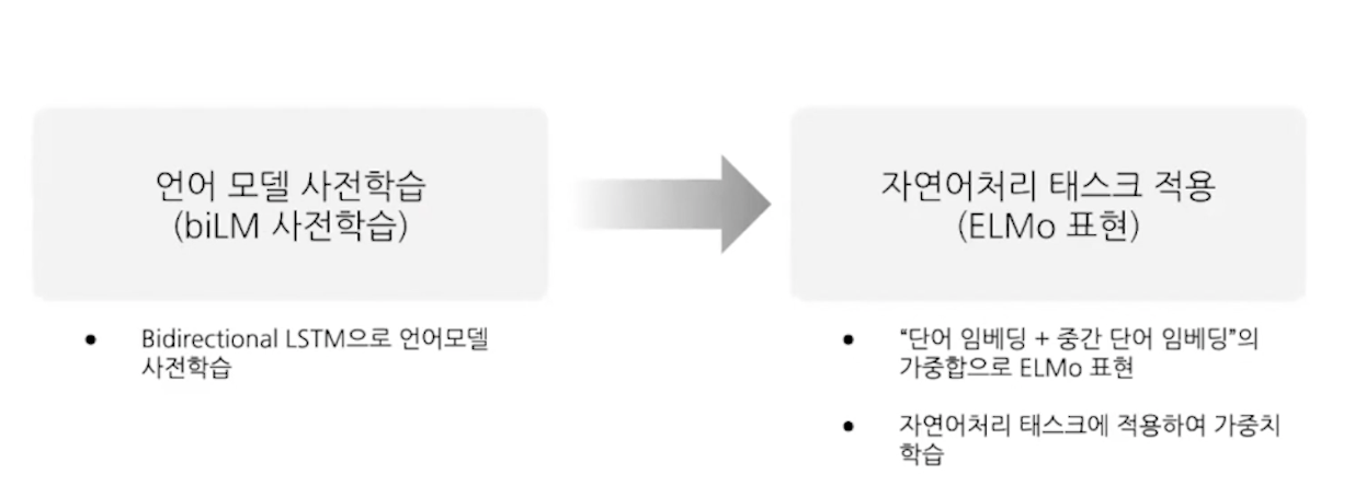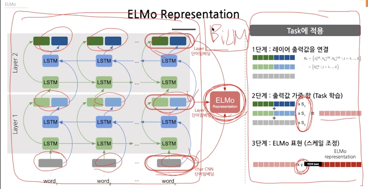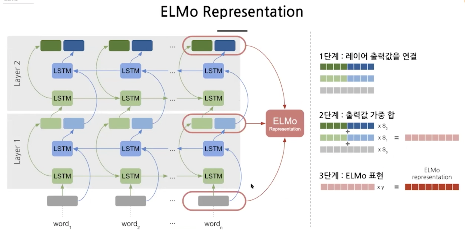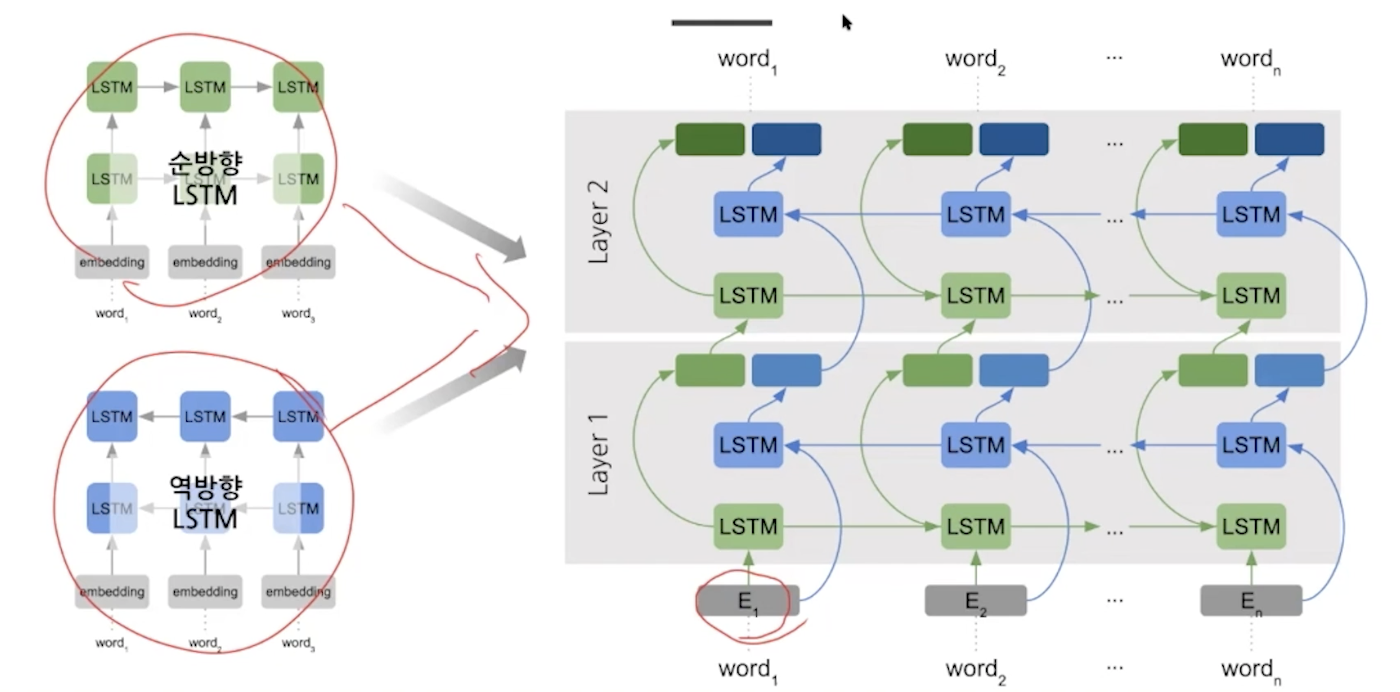실제 bidirection은 순,역방향이 함께 진행돼서 레이어 하나가 끝나면 하나의 벡터로 만들어지는데 elmo는 두 개가 독립적으로 진행돼서 두개의 벡터(concat)가 만들어진다.