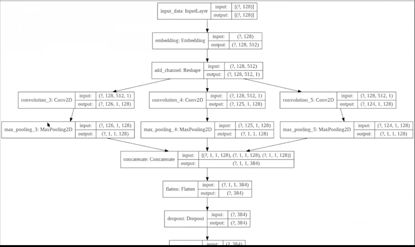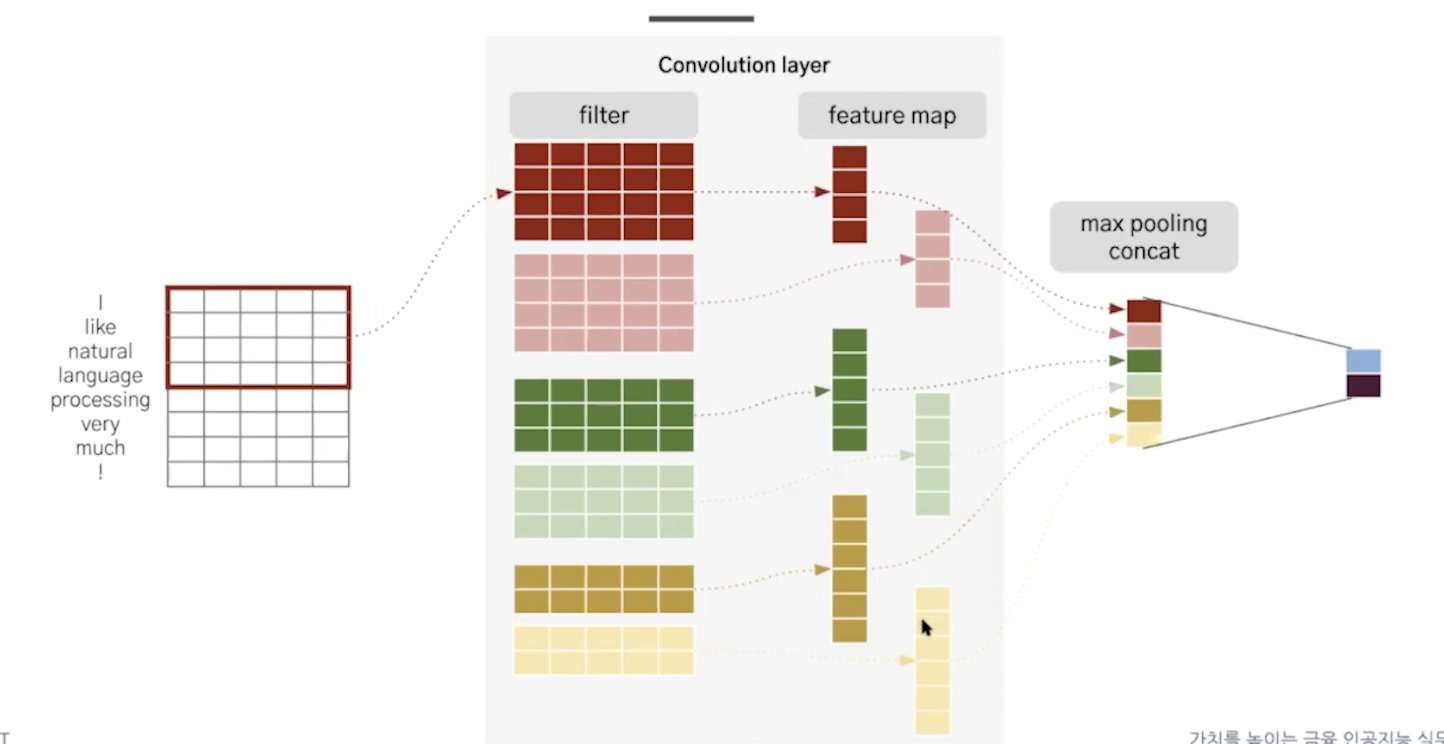 단어를 임베딩해서 벡터로 만들고 이를 필터를 통과시켜서 피쳐맵을 뽑고 풀링한 후 concat하고 dense layer에 통과시킨다.