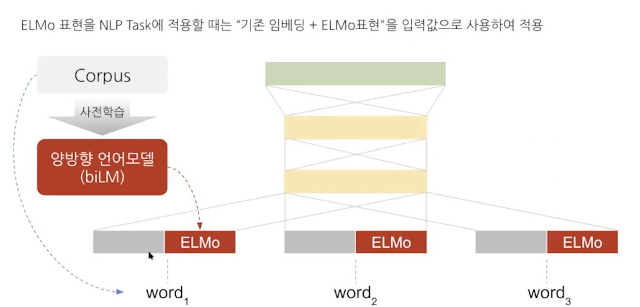 임베딩을 제외하고 task를 위한 layers만 학습하는 것이 아니고 elmo의 가중치 s를 학습하게 된다. 그래서 task에 적용될때 학습된다.