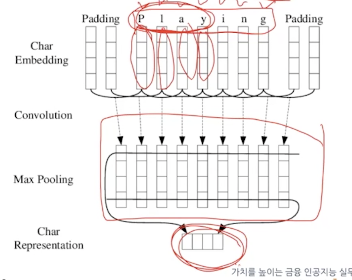 단어 벡터를 One hot vector, word2vec -> char cnn 임베딩 기법을 사용한다. cnn으로 단어를 임베딩한다.