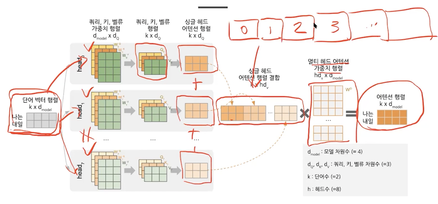 multi head -> concat -> linear ( 싱글 헤드 어텐션 행렬은 scaled dot product를 거친 상태를 의미힌다.)