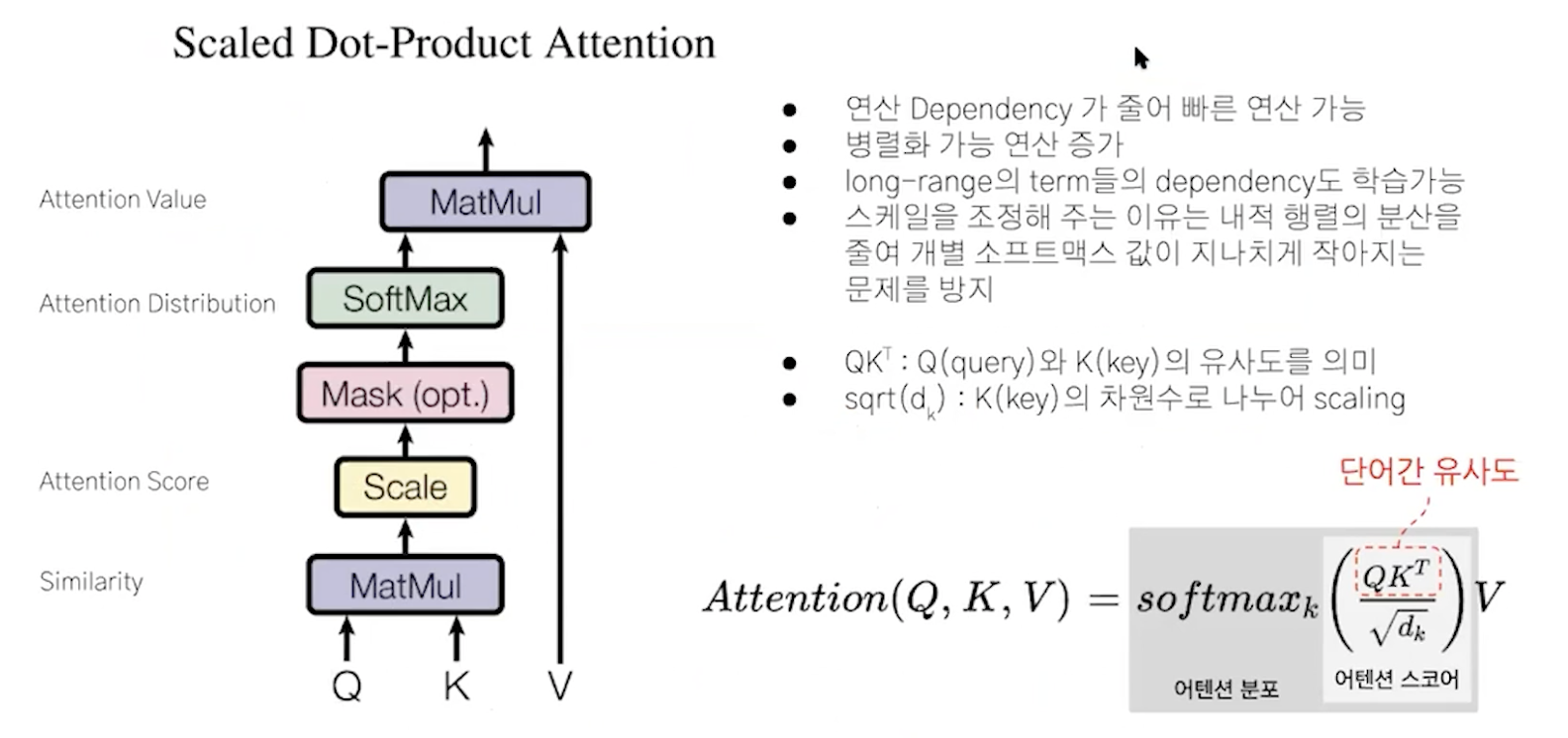 이해했으면 앞선 그림을 다시 살펴보자. 그러면 Q,K를 dot product하는 것은 결국 seq2seq with attention에서 decoder output과 ㅑencoder outputs간의 attention score을 구하는 것과 같다고 볼 수 있다.