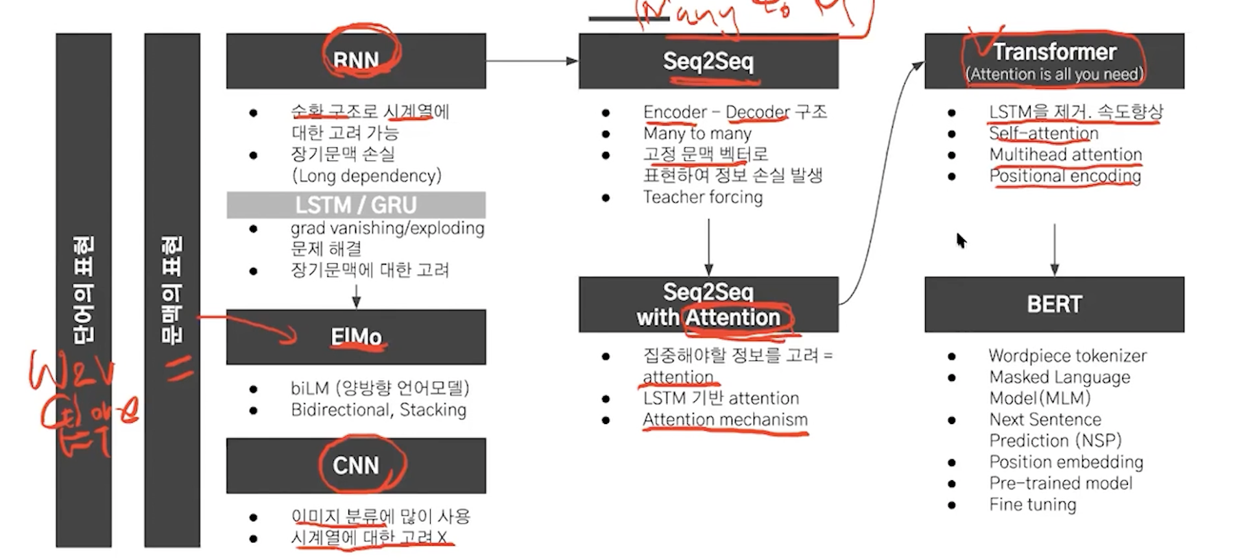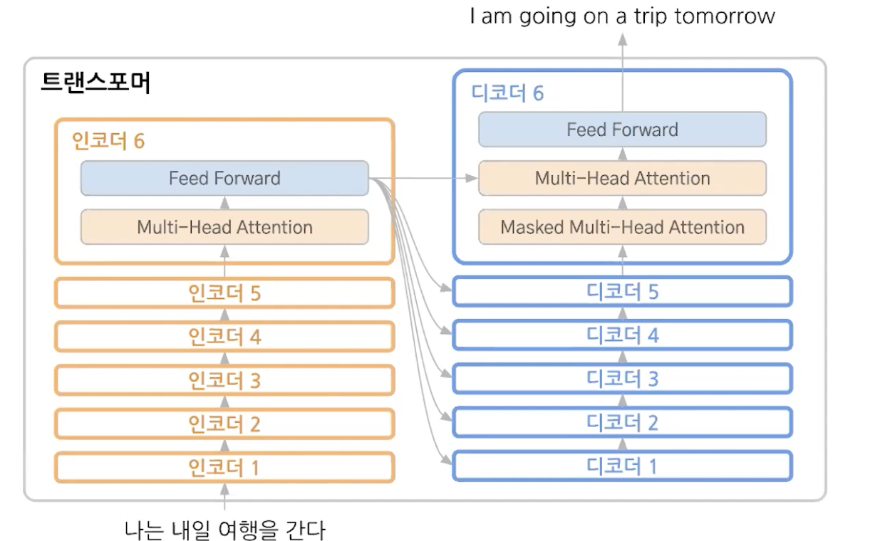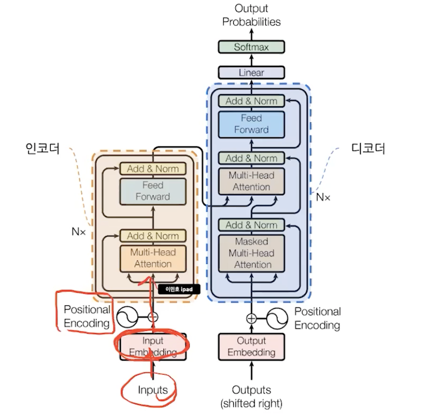 단어 -> id -> 임베딩 -> positional encoding -> encoder [ multi head attention -> residual connection -> train ] -> decoder [ masked multi head attention -> residual connection -> multi head attention with encoder outputs -> train] -> linear -> softmax