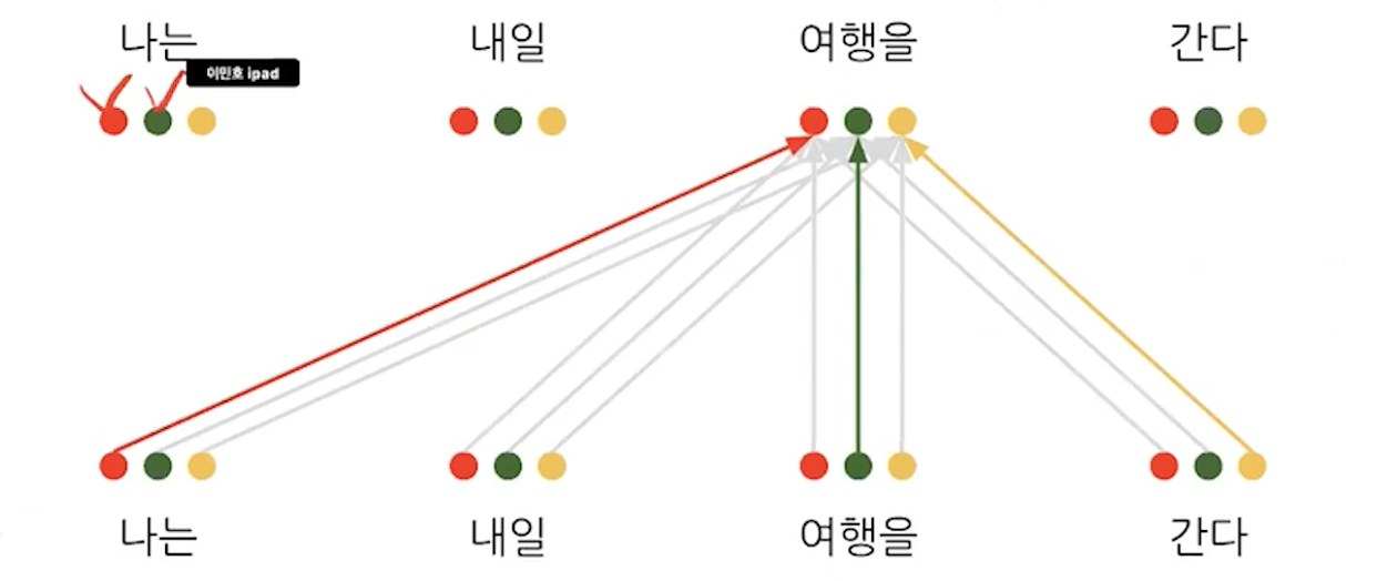 질문: '나는'이 주어라서 '여행을'과 attention이 높을 가능성이 있다고 했는데 단어의 유사도 자체는 높지 않은 것 아닌가? 그러면 처음에 임베딩했을때 '나는'에 대한 벡터와 '여행을'에 대한 벡터가 가까이 있어야겠네? word2vec과 같은 방법으로 하면 되나?