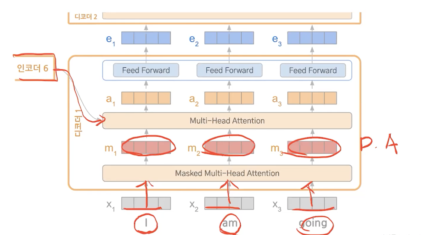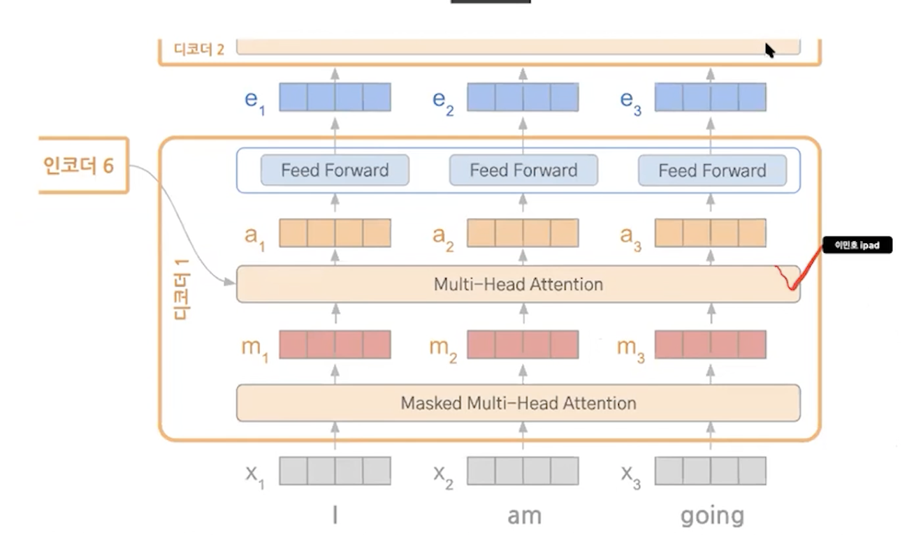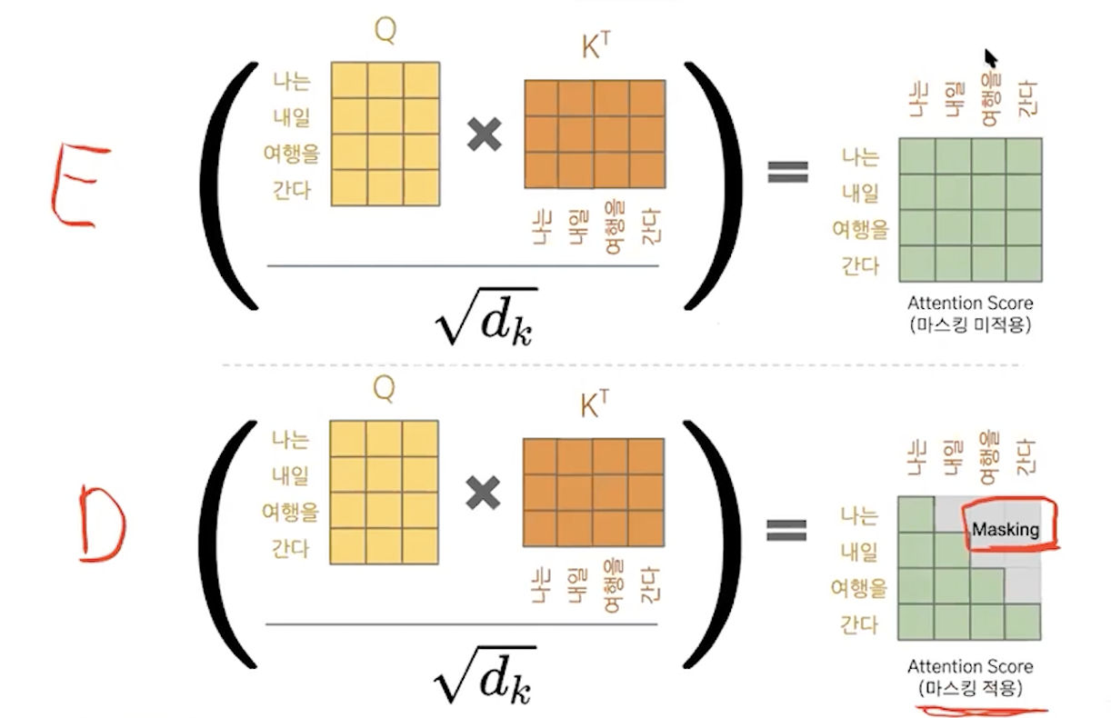 디코더에서 학습할때 디코더의 입력은 다음 단어가 뭐가 나올지 모른다는 가정하에 학습을 해서 masking을 하고 self attention을 하고