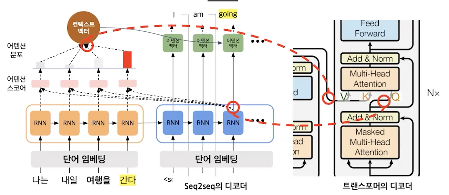 디코더끼리 attention vector을 만들고 인코더에서 context vector을 받아서 attention vector을 또 만든다.
