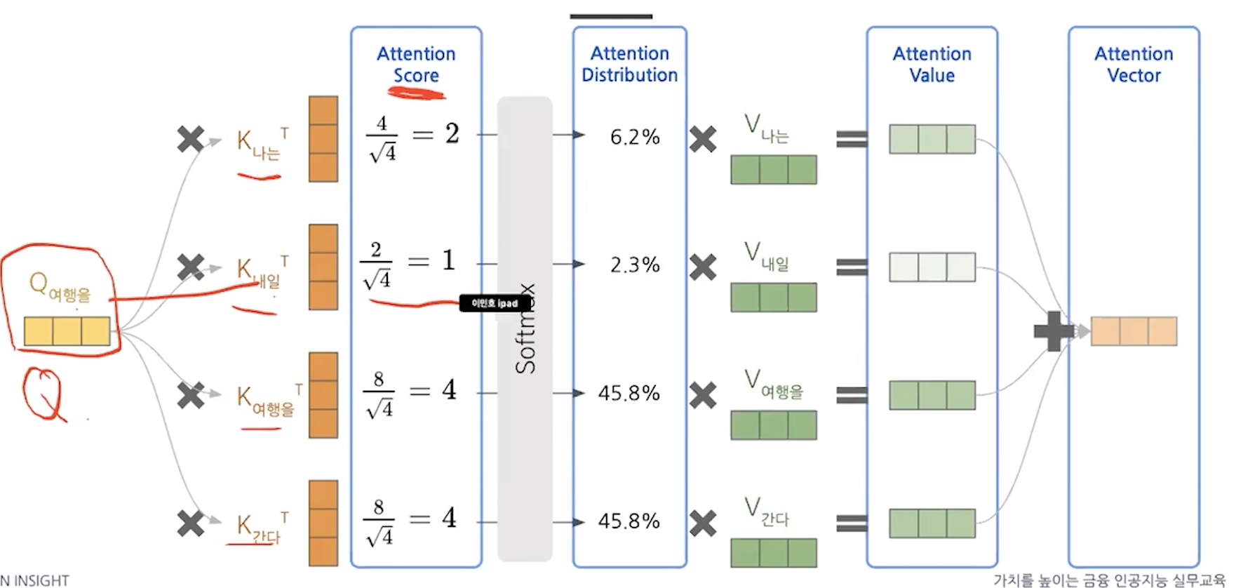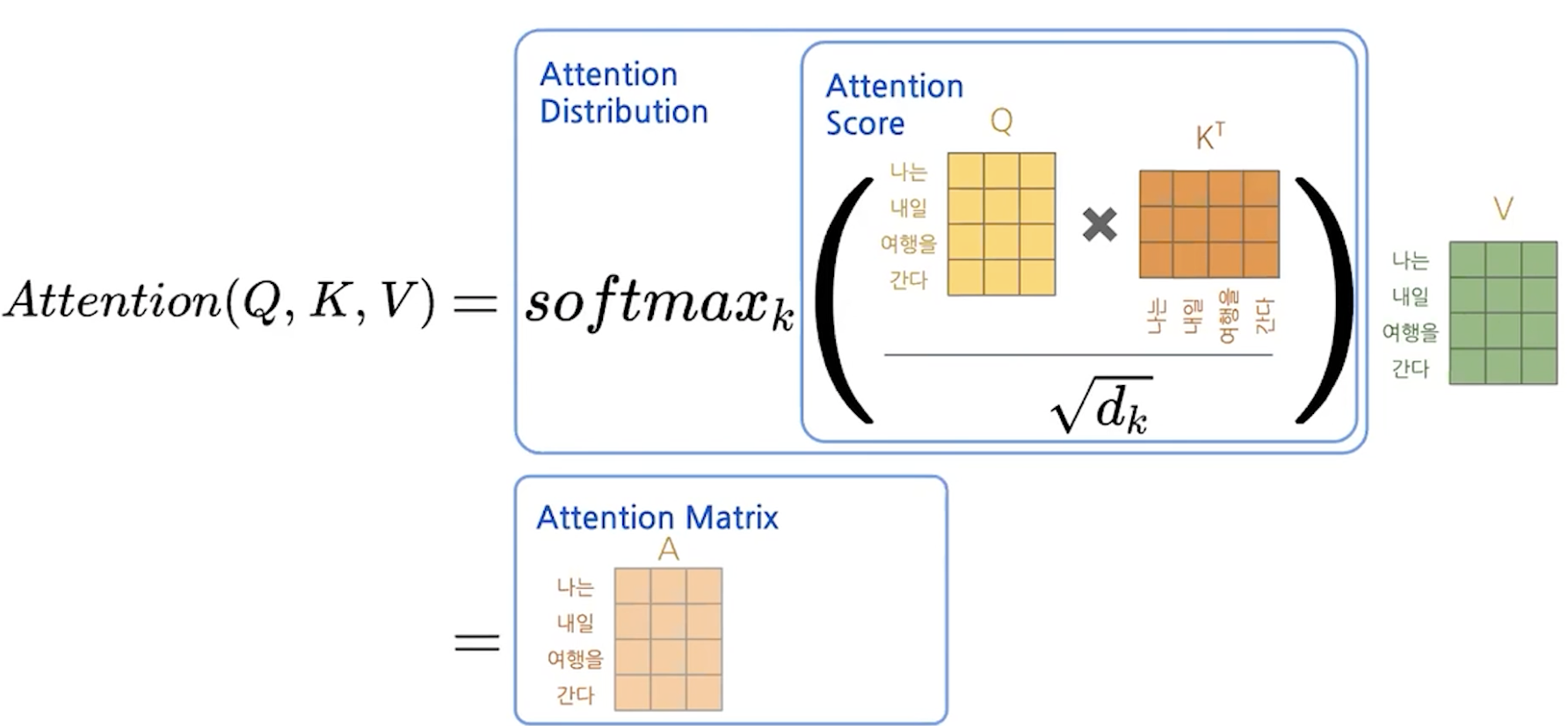 V: attention score -> 분포 -> 이 value를 사용한다.