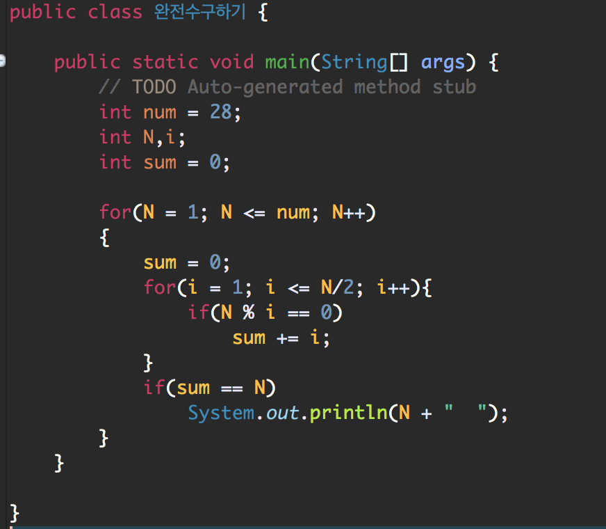 자기 자신을 제외한 모든 양의 약수들의 합이 자기 자신이 되는 자연수를 완전수라고 한다. 예를 들면, 6과 28은 완전수이다. 6=1+2+3 // 1,2,3은 각각 6의 약수 28=1+2+4+7+14 // 1,2,4,7,14는 각각 28의 약수